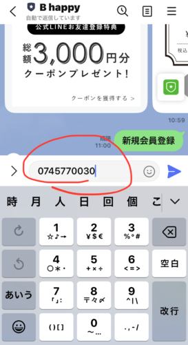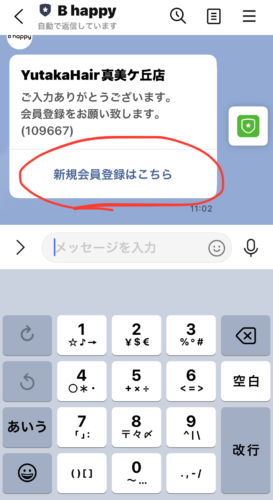 登録にはYutaka Hair真美ケ丘店の電話番号をトーク画面より送信頂きます。